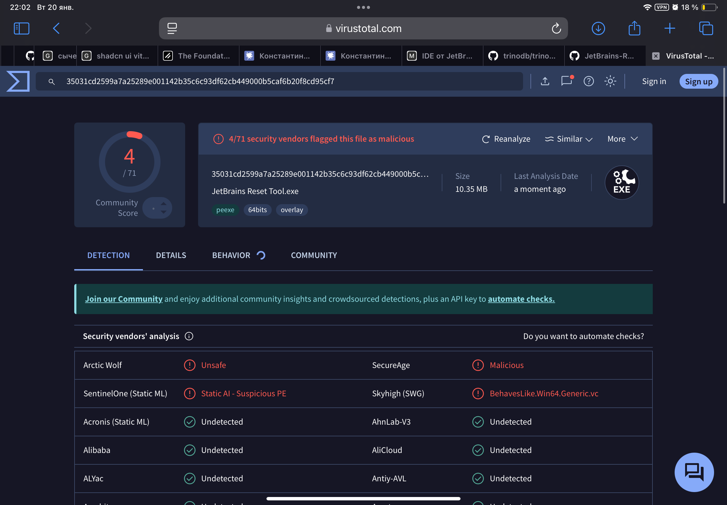 да, вирустотал может такое выдавать, тк мы лезем в реестр винды и удаляем ветку со всеми ее подразделами и значениями. по этой ветке пайчарм или любое другое ide от jetbrains определяет, сколько осталось времени до истечения триалки. также в репозитории есть полный исходный код, можешь спокойно проверить его и/или запускать именно его